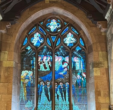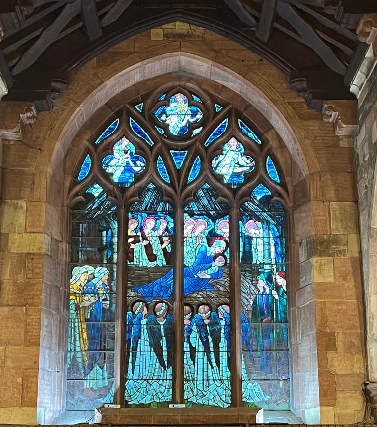 Earlier this morning after a leisurely breakfast of black coffee, croissant and marmalade, I visited the neighbouring church to see the last stained-glass window that Edward Burne-Jones would design before his death in 1898. There are a number of Burne-Jones window in the church of St Deiniol, Flintshire, however it is the west wall window that I have come to see, The adoration of the Shepherds and the Magi. I have been before, but this is the first time in good daylight. The sun’s extra lumens lift the window to its best and improve the experience immeasurably. Stained glass windows were conceived to let the light of God into the church. Sadly, Britain is wired on a dimmer switch. The sun moves the shapes and reflections of the window’s picture over the pews, the glass dances through the day. Glass is born in the eye of fire and is continually in its service.